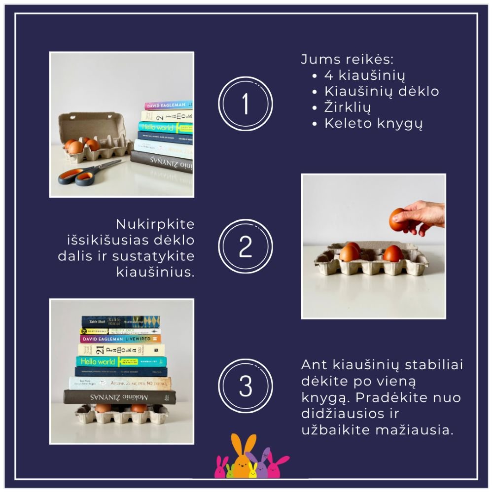 Velykų laikotarpis – tai ne tik marginimo tradicijos, bet ir pats tinkamiausias metas paversti namus tikra mokslinė laboratorija! Kiaušinis yra kur kas daugiau nei šventinio stalo akcentas – tai neįtikėtinas gamtos inžinerijos stebuklas, pasižymintis stebinančiomis fizikinėmis savybėmis. Kviečiame vaikus kartu su tėveliais leistis į atradimų kelionę ir praktiškai išbandyti, kokias „supergalias“ slepia kiaušinis. Ar jis gali išlaikyti sunkias knygas? Kodėl viename vandenyje jis skęsta, o kitame – plūduriuoja? Metas tai sužinoti šių eksperimentų metu!